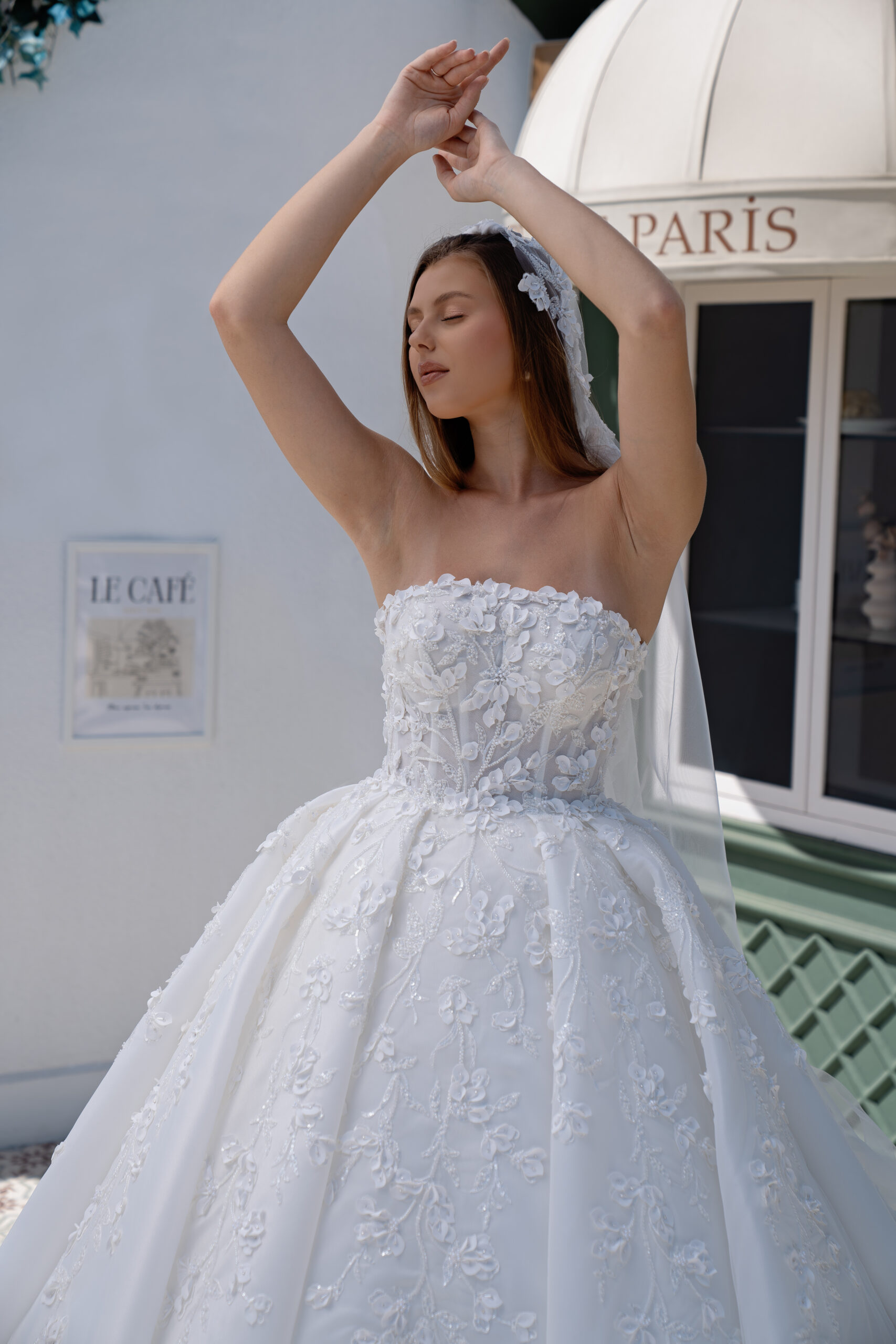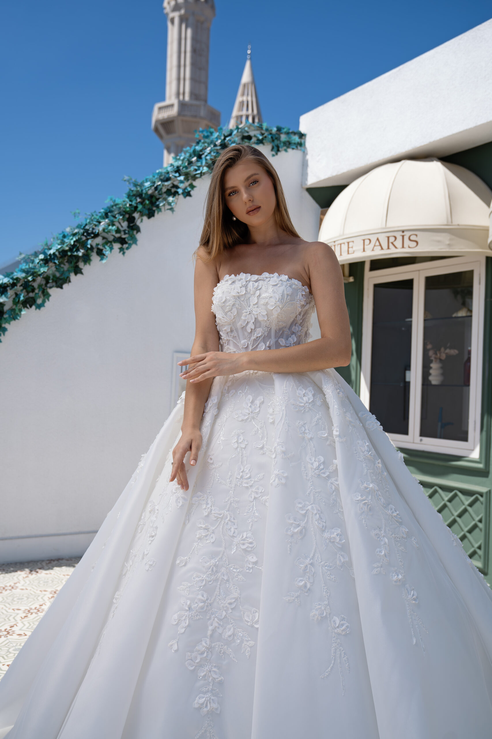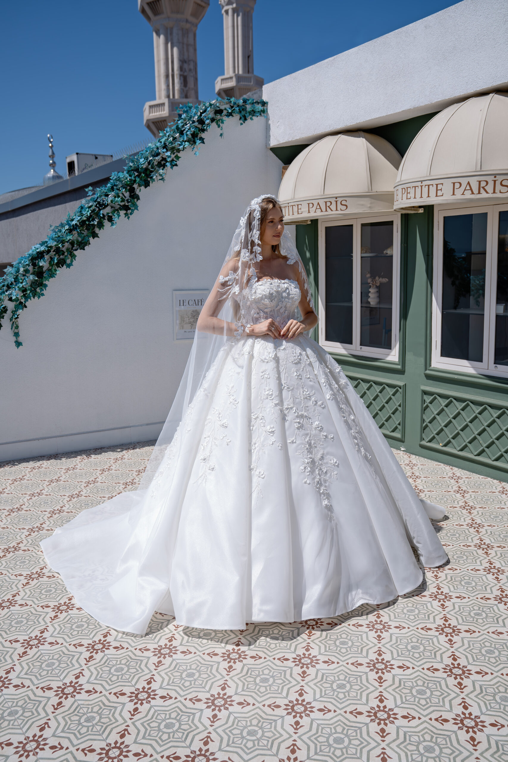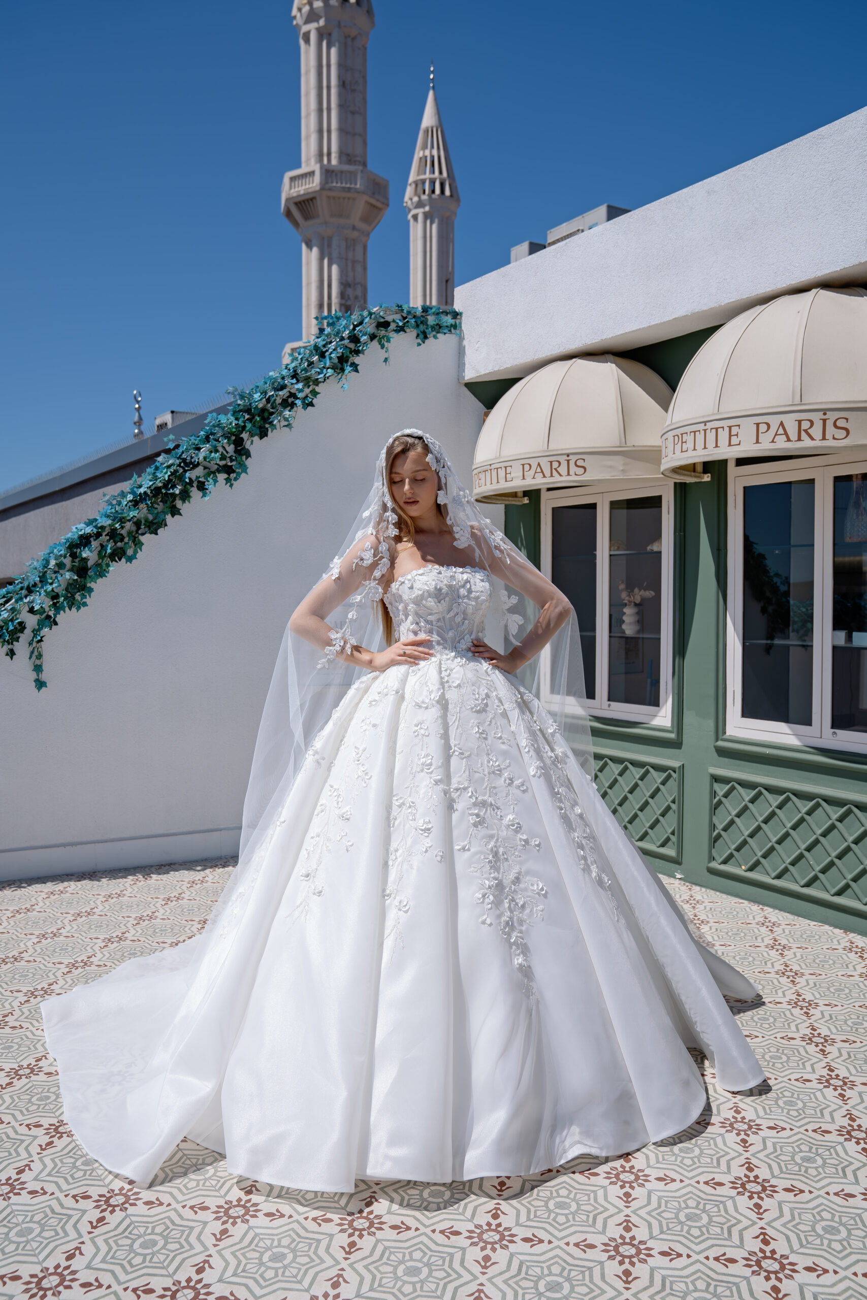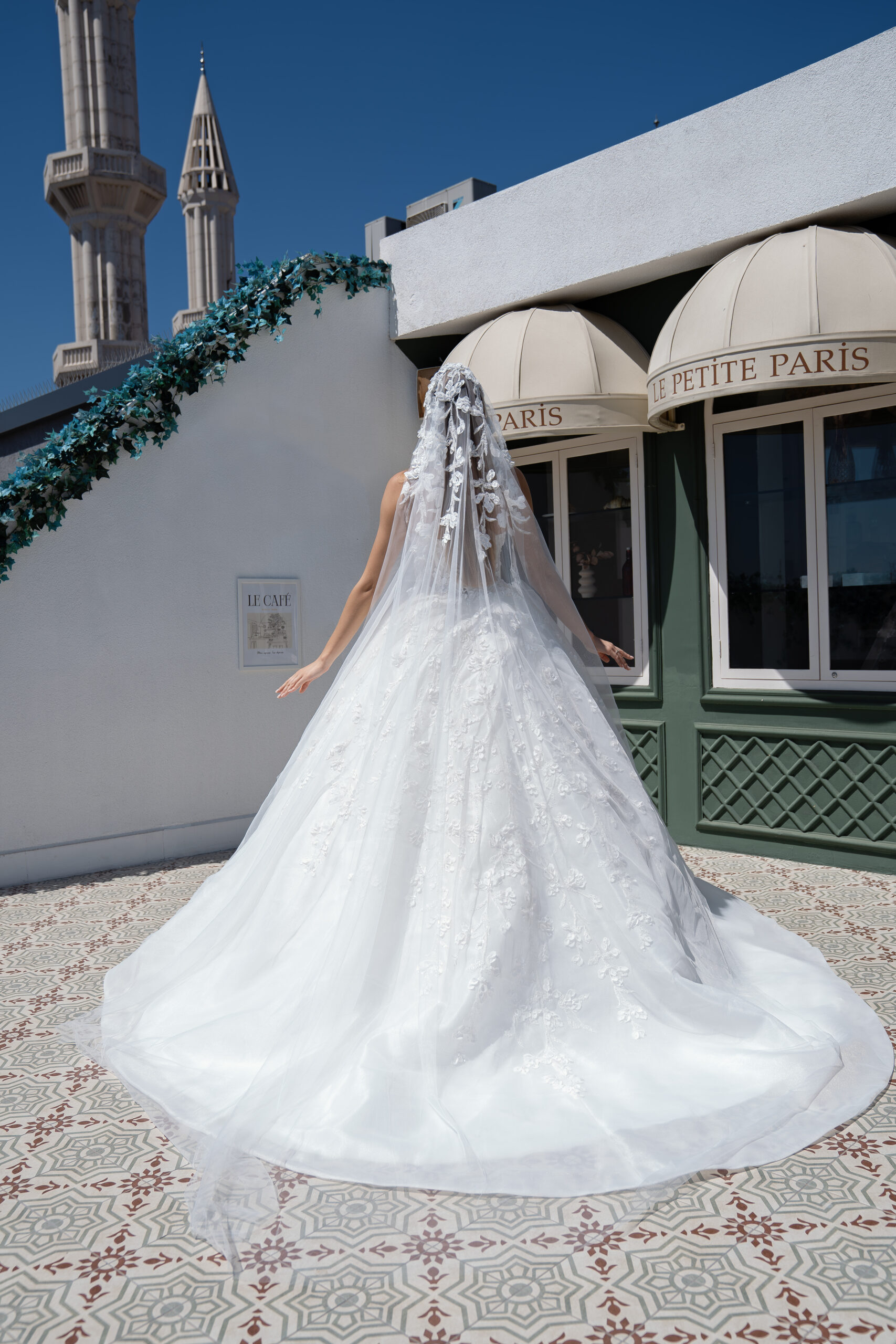 Crafted with delicate fabrics and couture level finishing, the gown embodies sophistication and purity.