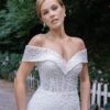 This design features a refined high neckline, long fitted sleeves, and a beautifully detailed lace train that flows elegantly behind.