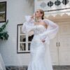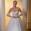 The fitted bodice, adorned with delicate French lace, flows seamlessly into a voluminous ball gown skirt, creating a look of true elegance and grace. Perfect for brides who dream of a fairytale entrance.