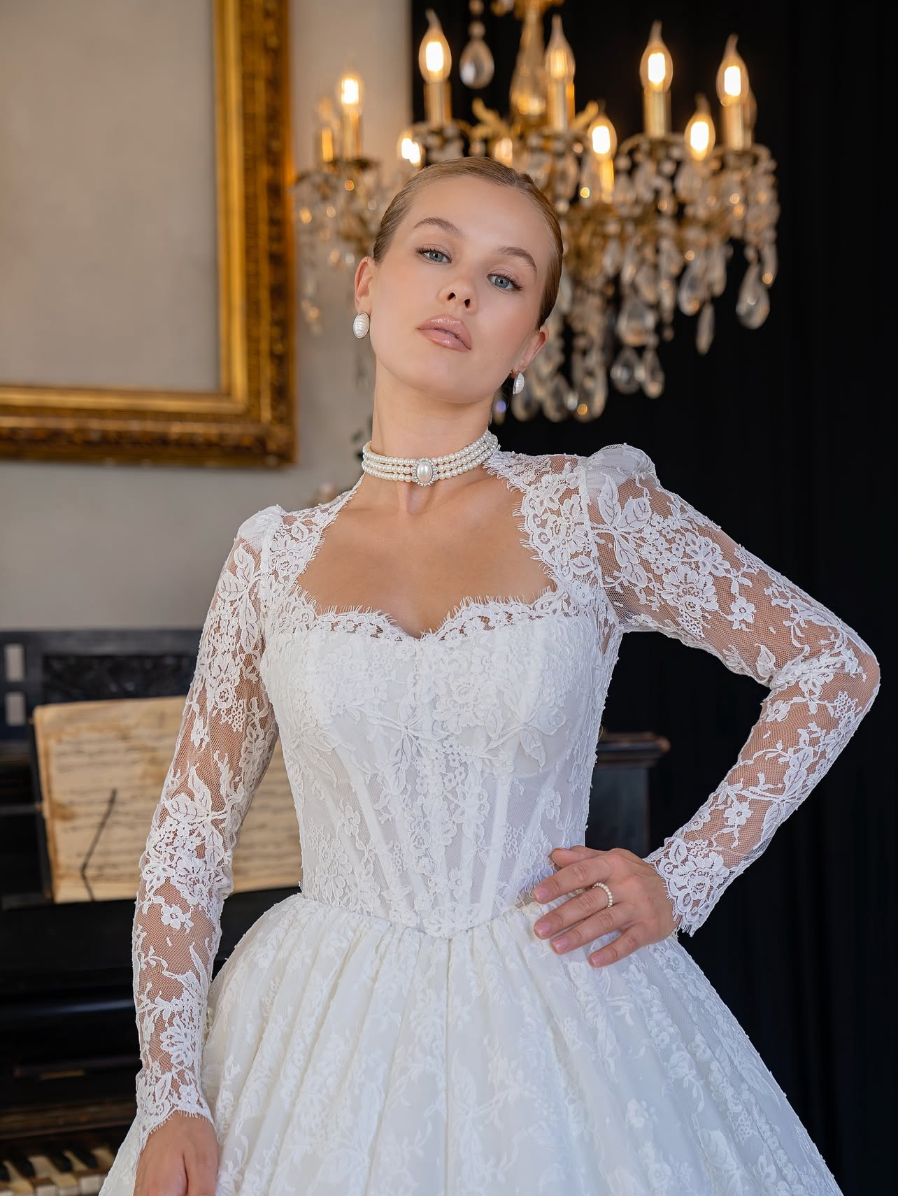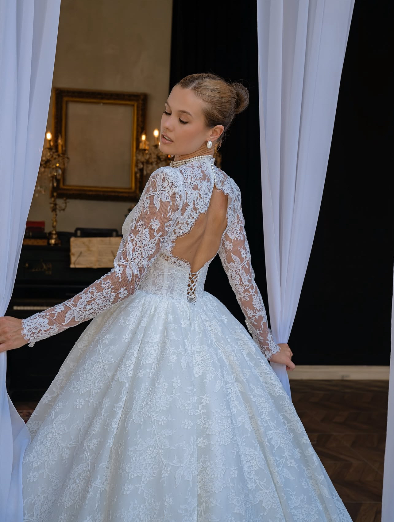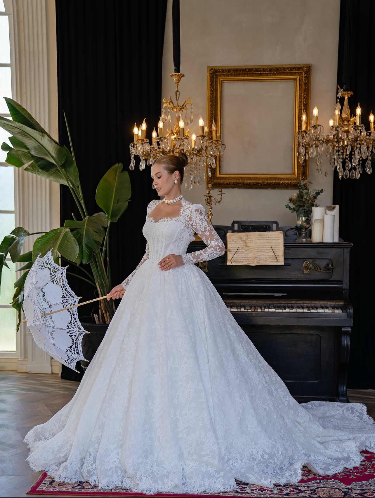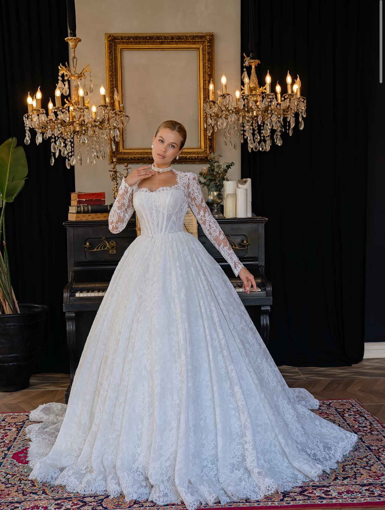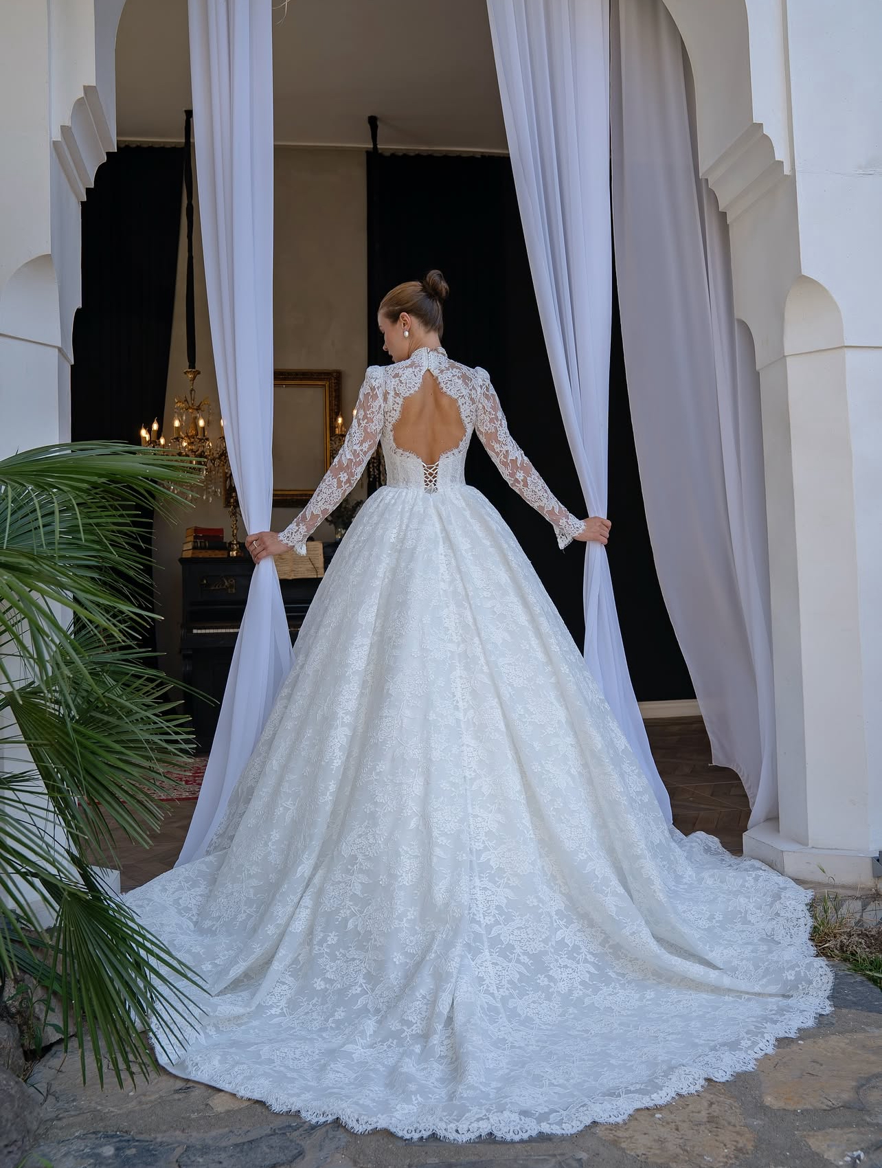 Special Details: Long lace sleeves, hand-applied lace patterns throughout, scalloped lace hem, and a dramatic cathedral-inspired train