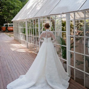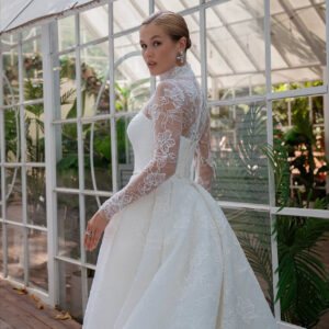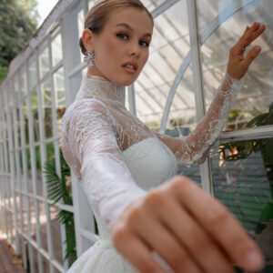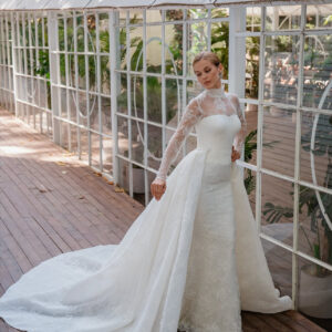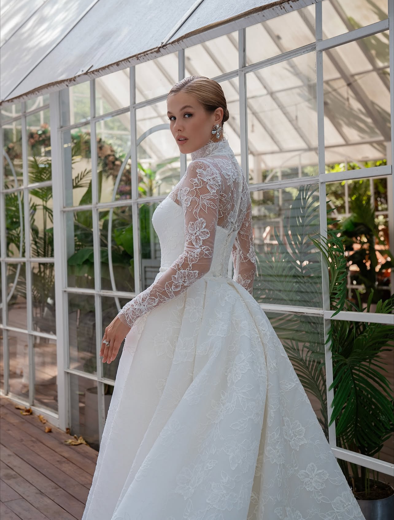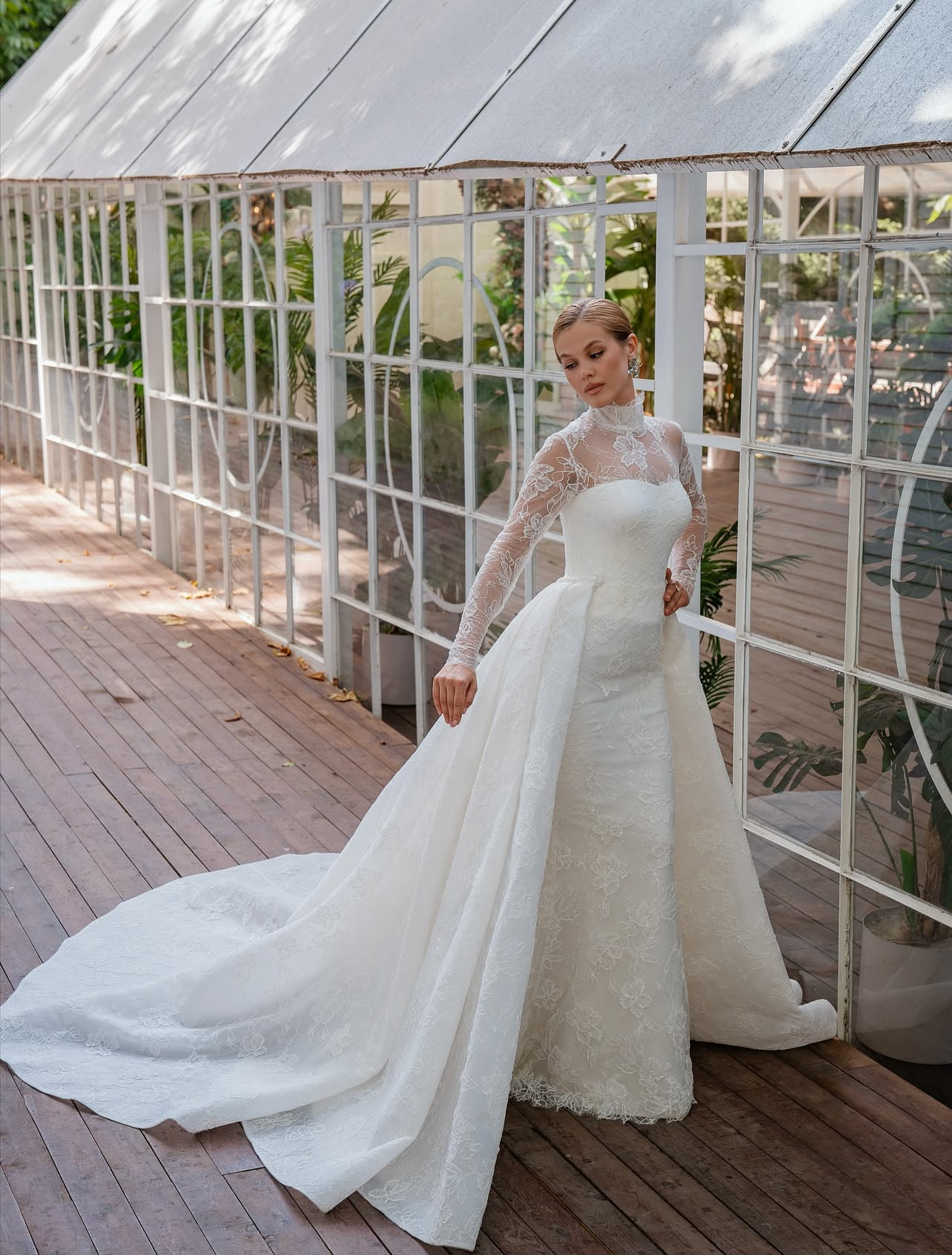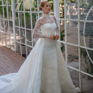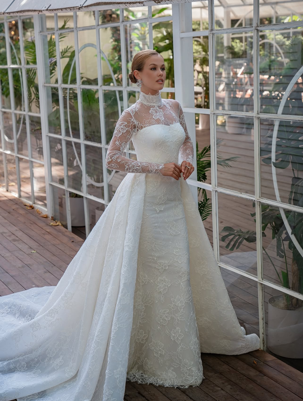This stunning wedding dress features a sophisticated high neck design crafted from delicate floral lace, offering both elegance and modesty. The fitted silhouette beautifully shapes the body, while the detachable overskirt adds dramatic volume and transforms the gown from a sleek look to a breathtaking ball gown style. Perfect for brides who want both simplicity and grandeur in one design. The long lace sleeves and intricate embroidery create a timeless and luxurious appearance, ideal for classic, romantic, and high-fashion weddings.