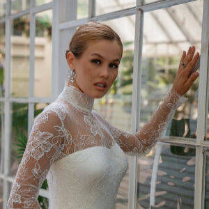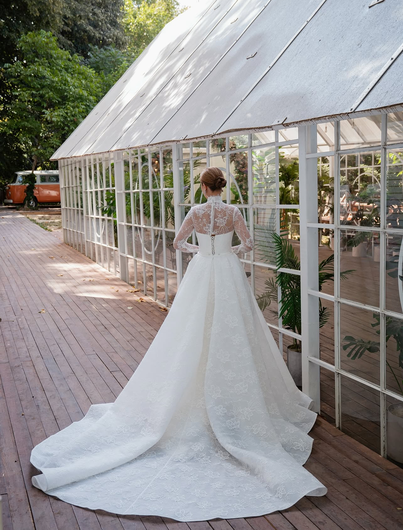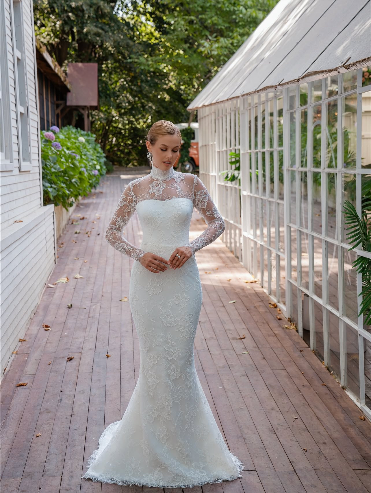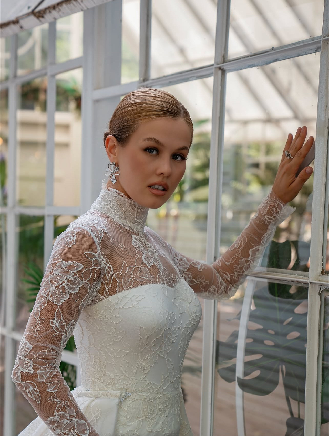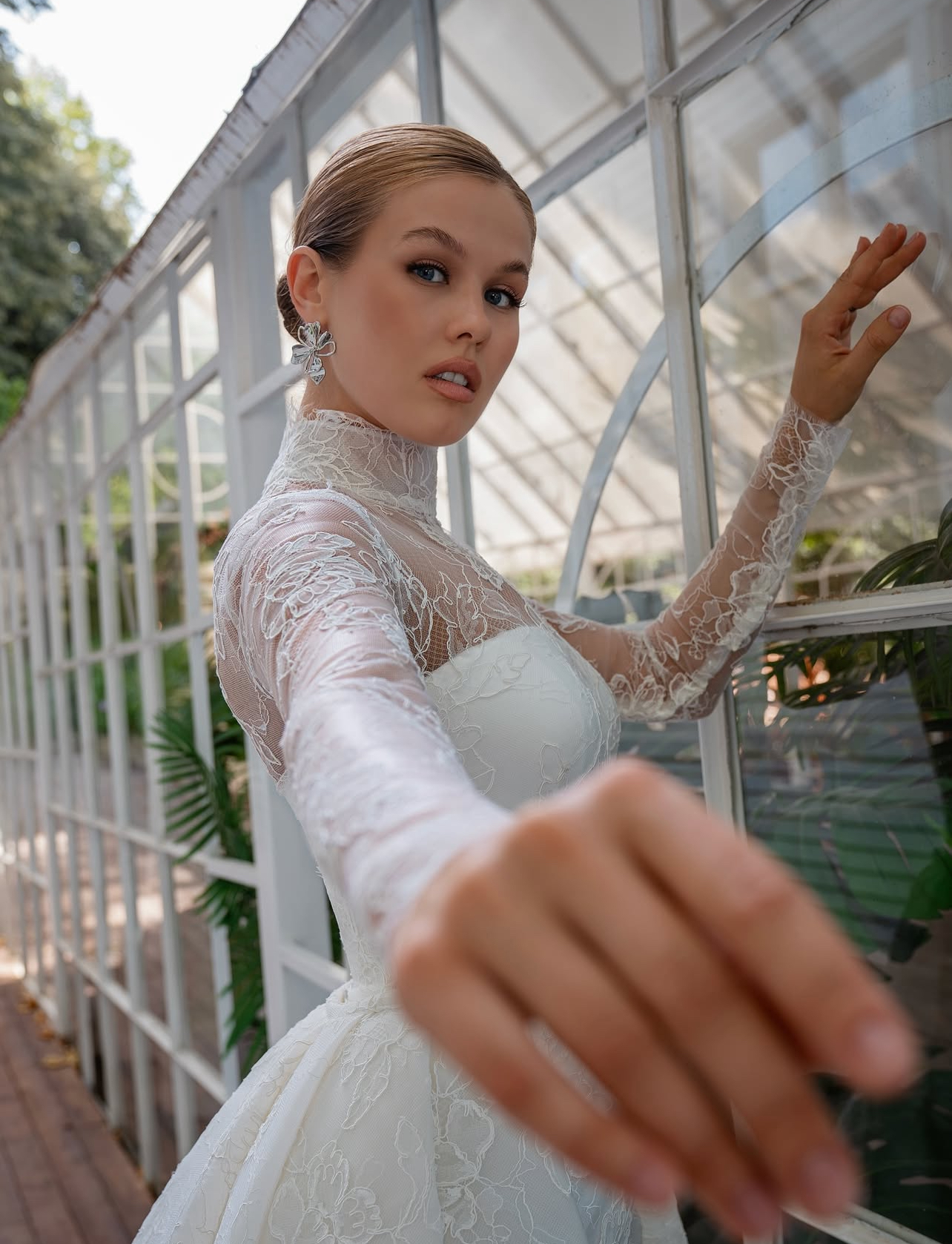 This stunning wedding dress features a sophisticated high neck design crafted from delicate floral lace, offering both elegance and modesty. The fitted silhouette beautifully shapes the body, while the detachable overskirt adds dramatic volume and transforms the gown from a sleek look to a breathtaking ball gown style. Perfect for brides who want both simplicity and grandeur in one design. The long lace sleeves and intricate embroidery create a timeless and luxurious appearance, ideal for classic, romantic, and high-fashion weddings.